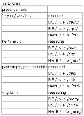 re·assure [reassurereassuresreassuredreassuring] BrE [ˌriːəˈʃʊə(r)] BrE [ˌriːəˈʃɔː(r)] NAmE [ˌriːəˈʃʊr] verb to say or do sth that makes sb less frightened or worried Syn: ↑set somebody's mind at rest •~ sb (about sth) They tried to reassure her, but she still felt anxious. •~ sb that… The doctor reassured him that there was nothing seriously wrong. Verb forms: