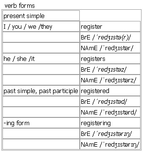 regis·ter AW [register registers registered registering] verb, noun BrE [ˈredʒɪstə(r)] NAmE [ˈredʒɪstər]
