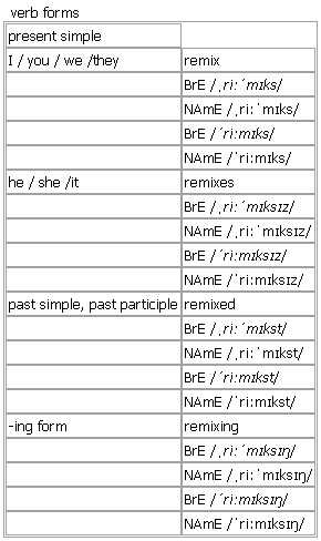 ▪ I. remix [remix remixes remixed remixing] BrE [ˌriːˈmɪks] NAmE [ˌriːˈmɪks] verb ~ sth to make a new version of a recorded piece of music by using a machine to arrange the separate parts of the recording in a different way, add new parts, etc •The band have released a remixed version of their first single. Derived Word: ↑remixer See also: ↑mix Verb forms:  ▪ II. remix BrE [ˈriːmɪks] ; NAmE [ˈriːmɪks] (also mix)noun •a remix of their first single •an Elton John remix Main entry: ↑remixderived