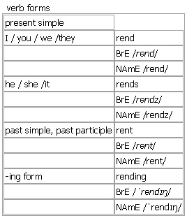rend [rend rends rent rending] BrE [rend] NAmE [rend] verb (rent, rentBrE [rent] ; NAmE [rent] )~ sth (old use or literary) to tear sth apart with force or violence •They rent their clothes in grief. • (figurative)a country rent in two by civil war • (figurative)Loud screams rent the air. see also ↑heart-rending Verb forms: Word Origin: Old English rendan; related to Middle Low German rende.