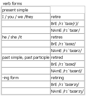 re·tire [retire retires retired retiring] BrE [rɪˈtaɪə(r)] NAmE [rɪˈtaɪər] verb