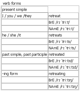 re·treat [retreat retreats retreated retreating] verb, noun BrE [rɪˈtriːt] NAmE [rɪˈtriːt] verb FROM DANGER/DEFEAT 1. intransitive to move away from a place or an enemy because you are in danger or because you have been defeated •The army was forced to retreat after suffering heavy losses. •We retreated back down the mountain. •They retreated to a safe distance from the fighting. Opp: ↑advance MOVE AWAY/BACK 2. intransitive to move away or back Syn: ↑recede •He watched her retreating figure. •The flood waters slowly retreated. CHANGE DECISION 3. intransitive + adv./prep. to change your mind about sth because of criticism or because a situation has become too difficult Syn: ↑back off •The government had retreated from its pledge to reduce class sizes. •He told them not to retreat in the face of opposition from the public. TO QUIET PLACE 4. intransitive (+ adv./prep.) to escape to a place that is quieter or safer Syn: ↑retire •Bored with the conversation, she retreated to her bedroom. • (figurative)He retreated into a world of fantasy. FINANCE 5. intransitive + noun to lose value •Share prices retreated 45p to 538p. Verb forms: Word Origin: late Middle English: from Old French retret (noun), retraiter (verb), from Latin retrahere ‘pull back’, from re- ‘back’ + trahere ‘drag’. Example Bank: •He retreated behind the table. •He retreated hastily back to his car. •He retreated in the face of strong opposition. •He retreated into his own world. •I heard her footsteps retreat down the hall. •Sandy retreated slowly, wary of what the man might do. •She retreated from the busy office to her own room. •The army has been ordered to retreat. •They retreated before the Americans. •She told them not to retreat in the face of opposition from the public. noun FROM DANGER/DEFEAT 1. countable, usually singular, uncountable a movement away from a place or an enemy because of danger or defeat •Napoleon's retreat from Moscow •The army was in full retreat (= retreating very quickly). •to sound the retreat (= to give a loud signal for an army to move away) ESCAPE 2. countable, usually singular, uncountable ~ (from/into sth) an act of trying to escape from a particular situation to one that you think is safer or more pleasant Syn: ↑escape •Is watching television a retreat from reality? CHANGE OF DECISION 3. countable, usually singular an act of changing a decision because of criticism or because a situation has become too difficult •The Senator made an embarrassing retreat from his earlier position. QUIET PLACE 4. countable a quiet, private place that you go to in order to get away from your usual life •a country retreat 5. uncountable, countable a period of time when sb stops their usual activities and goes to a quiet place for prayer and thought; an organized event when people can do this •He went into retreat and tried to resolve the conflicts within himself. •to go on a Buddhist retreat see beat a (hasty) retreat at ↑beat v. Word Origin: late Middle English: from Old French retret (noun), retraiter (verb), from Latin retrahere ‘pull back’, from re- ‘back’ + trahere ‘drag’. Collocations: War and peace Starting a war declare/make/wage war (on sb/sth) go to war (against/with sb) cause/spark/provoke/foment/quell unrest incite/lead/crush/suppress a revolt/rebellion launch/mount/carry out a surprise/terrorist attack prevent/halt/represent an escalation of the conflict be torn apart by/be on the brink of civil war enter/invade/occupy sb's territory lead/launch/resist/repel an invasion Military operations adopt/develop/implement/pursue a military strategy carry out/execute/perform military operations/manoeuvres/(especially US) maneuvers send/deploy/station/pull back/withdraw troops go on/fly/carry out a reconnaissance/rescue mission train/equip/deploy army/military/combat units lead/launch/conduct a raid/a surprise attack/an (air/airborne/amphibious) assault (on sb) employ/use guerrilla tactics conduct/wage biological/guerrilla warfare fight/crush/defeat the rebels/the insurgency suffer/inflict a crushing defeat achieve/win a decisive victory halt/stop the British/German/Russian advance order/force a retreat Fighting join/serve in the army/navy/air force be/go/remain/serve on active duty serve/complete/return from a tour of duty be sent to the front (line) attack/strike/engage/defeat/kill/destroy the enemy see/report/be engaged in heavy fighting call for/be met with armed resistance come under heavy/machine-gun/mortar fire fire a machine-gun/mortar shells/rockets (at sb/sth) shoot a rifle/a pistol/bullets/missiles launch/fire a cruise/ballistic/anti-tank missile use biological/chemical/nuclear weapons inflict/suffer/sustain heavy losses/casualties be hit/killed by enemy/friendly/artillery fire become/be held as a prisoner of war Civilians in war harm/kill/target/protect innocent/unarmed civilians cause/avoid/limit/minimize civilian casualties/collateral damage impose/enforce/lift a curfew engage in/be a victim of ethnic cleansing be sent to an internment/a concentration camp accept/house/resettle refugees fleeing from war fear/threaten military/violent reprisals commit/be accused of war crimes/crimes against humanity/genocide Making peace make/bring/win/achieve/maintain/promote peace call for/negotiate/broker/declare a ceasefire/a temporary truce sign a ceasefire agreement call for/bring/put an end to hostilities demand/negotiate/accept the surrender of sb/sth establish/send (in) a peacekeeping force negotiate/conclude/ratify/sign/accept/reject/break/violate a peace treaty Example Bank: •Camp David, the presidential retreat in Maryland •Eventually the police forced the crowd into retreat. •He took part in the retreat from Paris. •He went into retreat at his country home to escape the attention of the media. •I decided to beat a hasty retreat. •I made a tactful retreat before they started arguing. •I went o
