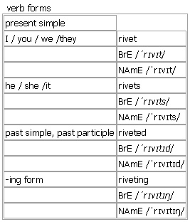 rivet [rivet rivets riveted riveting] noun, verb BrE [ˈrɪvɪt] NAmE [ˈrɪvɪt] noun a metal pin that is used to fasten two pieces of leather, metal, etc. together Word Origin: Middle English: from Old French, from river ‘fix, clinch’, of unknown ultimate origin. Idiom: ↑riveted to the spot verb usually passive 1. ~ sb/sth to hold sb's interest or attention so completely that they cannot look away or think of anything else •I was absolutely riveted by her story. •My eyes were riveted on the figure lying in the road. •Public attention was riveted on this topic on both sides on the Atlantic. 2. ~ sth to fasten sth with ↑rivets •The steel plates were riveted together. Verb forms: Word Origin: Middle English: from Old French, from river ‘fix, clinch’, of unknown ultimate origin. Example Bank: •He started to speak, and everyone was riveted to him. •People were absolutely riveted as she described what happened. •Public attention was riveted on this topic on both sides of the Atlantic. •The portrait on the wall riveted her attention.