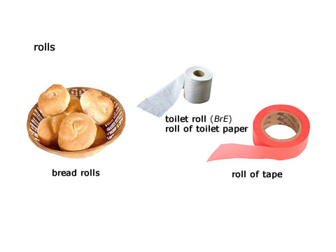 roll [roll rolls rolled rolling] noun, verb BrE [rəʊl] NAmE [roʊl] noun OF PAPER/CLOTH, ETC. 1. countable ~ (of sth) a long piece of paper, cloth, film, etc. that has been wrapped around itself or a tube several times so that it forms the shape of a tube •a roll of film • Wallpaper is sold in rolls. see also ↑toilet roll OF SWEETS/CANDY 2. countable ~ (of sth) (NAmE)a paper tube wrapped around sweets/candy, etc •a roll of mints BREAD 3. (also ˌbread ˈroll)countable a small ↑loaf of bread for one person •Soup and a roll: £3.50 •a chicken/cheese, etc. roll (= filled with chicken/cheese, etc.) compare ↑bun see also ↑sausage roll, ↑spring roll, ↑Swiss roll OF BODY 4. singular an act of rolling the body over and over • The kittens were enjoying a roll in the sunshine. 5. countable a physical exercise in which you roll your body on the ground, moving your back and legs over your head •a forward/backward roll OF SHIP/PLANE 6. uncountable the act of moving from side to side so that one side is higher than the other compare ↑pitch n. (8) OF FAT 7. countable an area of too much fat on your body, especially around your waist •Rolls of fat hung over his belt. LIST OF NAMES 8. countable an official list of names •the electoral roll (= a list of all the people who can vote in an election) •The chairman called/took the roll (= called out the names on a list to check that everyone was present). see also ↑payroll SOUND 9. countable ~ (of sth) a deep continuous sound •the distant roll of thunder •a drum roll OF DICE 10. countable an act of rolling a ↑dice •The order of play is decided by the roll of a dice. PHONETICS 11. = ↑trill (3) Word Origin: Middle English: from Old French rolle (noun), roller (verb), from Latin rotulus ‘a roll’, variant of rotula ‘little wheel’, diminutive of rota. Thesaurus: roll noun C •Wallpaper is sold in rolls. bundle • • wad • • reel • |especially AmE spool • a roll/bundle/wad/reel/spool of sth in a roll/bundle/wad/reel/spool on a roll/reel/spool Example Bank: •Eligible voters had been removed from the voting rolls. •Falling rolls could lead to smaller class sizes. •He did a forward roll to celebrate his goal. •He should be struck off the roll of solicitors. •Her name was engraved on sport's roll of honour. •I wiped up the milk with a piece of kitchen roll. •My daughter's grades improved and she made the honor roll. •Staff evacuated the building and a roll call was taken outside. •The appeal against the sentence is Beale's last roll of the dice. •The chairman called the roll. •The dog had a good roll on the lawn. •The local authority has 50 000 pupils on roll. •There are 340 children on the school roll. •a roll of banknotes/carpet/film •Around 600 million toilet rolls are sold each year in the UK. •Drum roll, please! •Funding to the school will be reduced because of falling rolls. •I was late for roll-call. •Lightning flashed across the sky, immediately followed by a deep roll of thunder. •She pulled a roll of mints out of her purse and offered him one. •She put the new roll of film in the camera. •Take five bucks, go to the bank and get a roll of dimes. •There were several rolls of carpet stacked at the back of the shop. •Who would appear on your personal roll of honour? •You can check that you are on the electoral roll by calling this number. •a roll of dimes/mints Idioms: ↑let's roll ▪ ↑on a roll ▪ ↑roll in the hay ▪ ↑roll on …! ▪ ↑roll up your sleeves ▪ ↑roll with the punches ▪ ↑rolled into one ▪ ↑rolling in it ▪ ↑rolling in the aisles ▪ ↑rolling stone gathers no moss Derived: ↑roll around ▪ ↑roll in ▪ ↑roll over ▪ ↑roll somebody over ▪ ↑roll something back ▪ ↑roll something down ▪ ↑roll something out ▪ ↑roll something over ▪ ↑roll something up ▪ ↑roll up verb TURN OVER 1. intransitive, transitive to turn over and over and move in a particular direction; to make a round object do this •+ adv./prep. The ball rolled down the hill. • We watched the waves rolling onto the beach. •Tears rolled down her cheeks. •~ sth + adv./prep. Delivery men were rolling barrels across the yard. 2. intransitive, transitive to turn over and over or round and round while remaining in the same place; to make sth do this •(+ adv./prep.) a dog rolling in the mud • Her eyes rolled. •~ sth (+ adv./prep.) She rolled her eyes upwards (= to show surprise or disapproval). •He was rolling a pencil between his fingers. 3. intransitive, transitive ~ (sb/sth) over (onto sth) | ~ (sb/sth) (over) onto sth to turn over to face a different direction; to make sb/sth do this •~ over (onto sth) She rolled over to let the sun brown her back. •~ onto sth He rolled onto his back. •~ sb/sth (over) (onto sth) I rolled the baby over onto its stomach. •to roll a dice/die (= in a game) • (especially NAmE)She rolled her car in a 100 mph crash. MOVE (AS IF) ON WHEELS 4. intransitive, transitive to move smoothly (on wheels or as if on wheels); to make sth do this •(+ adv./prep.) The car began to roll back down the hill. • The traffic rolled slowly forwards. •Mist was rolling in from the sea. •~ sth (+ adv./prep.) He rolled the trolley across the room. MAKE BALL/TUBE 5. transitive, intransitive ~ (sth) (up) (into sth) to make sth/yourself into the shape of a ball or tube • I rolled the string into a ball. • We rolled up the carpet. •a rolled-up newspaper •I always roll my own (= make my own cigarettes). •The hedgehog rolled up into a ball. compare ↑unroll FOLD CLOTHING 6. transitive to fold the edge of a piece of clothing, etc. over and over on itself to make it shorter •~ sth up Roll up your sleeves. •~ sth + adv./prep. She rolled her jeans to her knees. MAKE STH FLAT 7. transitive ~ sth (out) to make sth flat by pushing sth heavy over it • Roll the pastry on a floured surfa