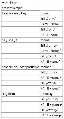 room [room rooms roomed rooming] noun, verb BrE [ruːm] NAmE [ruːm] BrE [rʊm] NAmE [rʊm] noun IN BUILDING 1. countable a part of a building that has its own walls, floor and ceiling and is usually used for a particular purpose • He walked out of the room and slammed the door. • They were in the next room and we could hear every word they said. •a dining/living/sitting room •They had to sit in the waiting room for an hour. •I think Simon is in his room (= bedroom). •I don't want to watch television. I'll be in the other room (= a different room). There are many compounds ending in room. You will find them at their place in the alphabet. -ROOMED/-ROOM 2. (in adjectives)having the number of rooms mentioned •a three-roomed/three-room apartment IN HOTEL 3. countable a bedroom in a hotel, etc •a double/single room • I'd like to book a room with a view of the lake. • She lets out rooms to students. PLACE TO LIVE 4. roomsplural (old-fashioned, BrE)a set of two or more rooms that you rent to live in Syn: ↑lodgings •They lived in rooms in Kensington. SPACE 5. uncountable empty space that can be used for a particular purpose •~ (for sb/sth) Is there enough room for me in the car? • There's room for one more at the table. •Do you have room for a computer on your desk? •Yes, there's plenty of room. •How can we make room for all the furniture? •I'll move the table— it takes up too much room. •~ (to do sth) Make sure you have plenty of room to sit comfortably. see also ↑elbow room, ↑headroom, ↑houseroom, ↑legroom, ↑standing room POSSIBILITY 6. uncountable ~ for sth the possibility of sth existing or happening; the opportunity to do sth •He had to be certain. There could be no room for doubt. •There's some room for improvement in your work (= it is not as good as it could be). •It is important to give children room to think for themselves. PEOPLE 7. singular all the people in a room • The whole room burst into applause. more at the elephant in the room at ↑elephant, freedom of/room for manoeuvre at ↑manoeuvre n., a smoke-filled room at ↑smoke n. Word Origin: Old English rūm, of Germanic origin; related to Dutch ruim, German Raum. Thesaurus: room noun U •Is there room in the car for me? space • • headroom • • legroom • room/space for/between sth room/space to do sth leave/make/create/save/take up room/space Room or space? Room is usually space that you have or need for some practical purpose; space can be used in the same way, or it can mean a feeling of space that you enjoy for its own sake: •The bright colours give a lovely feeling of space. ✗ The bright colours give a lovely feeling of room. Collocations: Travel and tourism Holidays/vacations have/take (BrE) a holiday/(NAmE) a vacation/a break/a day off/(BrE) a gap year go on/be on holiday/vacation/leave/honeymoon/safari/a trip/a tour/a cruise/a pilgrimage go backpacking/camping/hitchhiking/sightseeing plan a trip/a holiday/a vacation/your itinerary book accommodation/a hotel room/a flight/tickets have/make/cancel a reservation/(especially BrE) booking rent a villa/(both BrE) a holiday home/a holiday cottage (especially BrE) hire/ (especially NAmE) rent a car/bicycle/moped stay in a hotel/a bed and breakfast/a youth hostel/a villa/(both BrE) a holiday home/a caravan cost/charge $100 a/per night for a single/double/twin/standard/(BrE) en suite room check into/out of a hotel/a motel/your room pack/unpack your suitcase/bags call/order room service cancel/cut short a trip/holiday/vacation Foreign travel apply for/get/renew a/your passport take out/buy/get travel insurance catch/miss your plane/train/ferry/connecting flight fly (in)/travel in business/economy class make/have a brief/two-day/twelve-hour stopover/(NAmE also) layover in Hong Kong experience/cause/lead to delays check (in)/collect/get/lose (your) (especially BrE) luggage/(especially NAmE) baggage be charged for/pay excess baggage board/get on/leave/get off the aircraft/plane/ship/ferry taxi down/leave/approach/hit/overshoot the runway experience/hit/encounter severe turbulence suffer from/recover from/get over your jet lag/travel sickness The tourist industry attract/draw/bring tourists/visitors encourage/promote/hurt tourism promote/develop ecotourism build/develop/visit a tourist/holiday/(especially BrE) seaside/beach/ski resort work for/be operated by a major hotel chain be served by/compete with low-cost/(especially NAmE) low-fare/budget airlines book sth through/make a booking through/use a travel agent contact/check with your travel agent/tour operator book/be on/go on a package deal/holiday/tour buy/bring back (tacky/overpriced) souvenirs Example Bank: •A ripple of laughter ran round the room. •As soon as the teacher left the room there was uproar. •Do you have enough room? •Guests are requested to vacate their rooms by 11 a.m. •He emailed his report back to the news room. •He was pacing the room nervously. •I rented a room while looking for a house to buy. •I used to share a room with my sister. •I wandered restlessly around my room. •I was renting a tiny basement room at that time. •Our guests are sleeping in the spare room. •Police have set up an incident room at the scene of the murder. •She felt sick and the room was spinning. •She flew from room to room looking for the fire extinguisher. •She prowled around the room like a caged tiger. •Soaring room rates have put tourists off visiting the city. •Suddenly Katie burst into the room. •The patient was in a private room equipped with bathroom and TV. •The room adjoins the hotel kitchens. •The room contained little more than a table and chair. •The room fell silent as she rose to speak. •The room smelled of stale sweat and coffee. •The rooms are cramped and narrow. •The sales figures are good, but there is still room for improvement. •There is some wiggle room for varying interpretations. •This wine sh