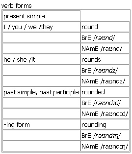 round [round rounds rounded rounding] adjective, adverb, preposition, noun, verb BrE [raʊnd] NAmE [raʊnd] adjective (round·er, round·est) 1. shaped like a circle or a ball •a round plate • These glasses suit people with round faces. • The fruit are small and round. •Rugby isn't played with a round ball. •the discovery that the world is round •The child was watching it all with big round eyes (= showing interest). •a T-shirt with a round neck see also ↑round-eyed, ↑round-table 2. having a curved shape •the round green hills of Donegal •round brackets (= in writing) • She had a small mouth and round pink cheeks. 3. only before noun a round figure or amount is one that is given as a whole number, usually one ending in 0 or 5 • Make it a round figure— say forty dollars. • Two thousand is a nice round number— put that down. •Well, in round figures (= not giving the exact figures) we've spent twenty thousand so far. Word Origin: Middle English: from the Old French stem round-, from a variant of Latin rotundus ‘rotund’. Thesaurus: round noun C •Italy qualified for the second round of the tournament. heat • • leg • • lap • • hole • • game • • set • • innings • • inning • • half • • quarter • in a/an round/heat/leg/game/set/innings/inning/half/quarter the first/second, etc. round/heat/leg/lap/hole/game/set/innings/inning/half/quarter win a round/heat/leg/hole/game/set Round or heat? Round is a more general word to describe a stage of a competition between teams or individuals; the whole competition may take place over several days, weeks or even months. Heats is used especially to describe the first round of a race between individuals, such as in running or swimming, in which the winners of each heat then compete in the semi-final or final. Example Bank: •She had a very round face. •Most of the county is undulating land, with low round hills and shallow valleys. •Put both the surname and publication date in round brackets. Idioms: ↑do the rounds ▪ ↑in the round ▪ ↑round about ▪ ↑round here Derived Word: ↑roundness Derived: ↑round on somebody ▪ ↑round somebody up ▪ ↑round something off adverb (especially BrE) (NAmE usually around)For the special uses of round in phrasal verbs, look at the verb entries. For example, the meaning of come round to sth is given in the phrasal verb section of the entry for come. 1. moving in a circle • Everybody joins hands and dances round. • How do you make the wheels go round? •The children were spinning round and round. • (figurative)The thought kept going round and round in her head. 2. measuring or marking the edge or outside of sth •a young tree measuring only 18 inches round • They've built a high fence all round to keep intruders out. 3. on all sides of sb/sth • A large crowd had gathered round to watch. 4. at various places in an area • People stood round waiting for something to happen. 5. in a circle or curve to face another way or the opposite way • He turned the car round and drove back again. • She looked round at the sound of his voice. 6. to the other side of sth • We walked round to the back of the house. • The road's blocked— you'll have to drive the long way round. 7. from one place, person, etc. to another • They've moved all the furniture round. • He went round interviewing people about local traditions. •Pass the biscuits round. •Have we enough cups to go round? 8. (informal)to or at a particular place, especially where sb lives • I'll be round in an hour. • We've invited the Frasers round this evening. more at (the) next, first, second, etc. time round at ↑time Word Origin: Middle English: from the Old French stem round-, from a variant of Latin rotundus ‘rotund’. Which Word?: around / round / about Around and round can often be used with the same meaning in BrE, though around is more formal: ▪ The earth goes round/around the sun. ◇ ▪ They live round/around the corner. ◇ ▪ We travelled round/around India. ◇ ▪ She turned round/around when I came in. In NAmE only around can be used in these meanings. Around, round and about can also sometimes be used with the same meaning in BrE: ▪ The kids were running around/round/about outside. ◇ ▪ I’ve been waiting around/round/about to see her all day. In NAmE only around can be used in these meanings. About or around can be used in both BrE and NAmE to mean ‘approximately’: ▪ We left around/about 8 o’clock. preposition (especially BrE) (NAmE usually around) 1. in a circle •the first woman to sail round the world • The earth moves round the sun. 2. on, to or from the other side of sth • Our house is round the next bend. • There she is, coming round the corner. •There must be a way round the problem. 3. on all sides of sb/sth; surrounding sb/sth • She put her arms round him. • He had a scarf round his neck. •They were all sitting round the table. 4. in or to many parts of sth • She looked all round the room. 5. to fit in with particular people, ideas, etc • He has to organize his life round the kids. more at a millstone round your/sb's neck at ↑millstone Word Origin: Middle English: from the Old French stem round-, from a variant of Latin rotundus ‘rotund’. Which Word?: around / round / about Around and round can often be used with the same meaning in BrE, though around is more formal: ▪ The earth goes round/around the sun. ◇ ▪ They live round/around the corner. ◇ ▪ We travelled round/around India. ◇ ▪ She turned round/around when I came in. In NAmE only around can be used in these meanings. Around, round and about can also sometimes be used with the same meaning in BrE: ▪ The kids were running around/round/about outside. ◇ ▪ I’ve been waiting around/round/about to see her all day. In NAmE only around can be used in these meanings. About or around can be used in both BrE and NAmE
