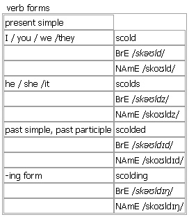 scold [scold scolds scolded scolding] BrE [skəʊld] NAmE [skoʊld] verb transitive, intransitive ~ sb (for sth/for doing sth) | (+ speech) (formal) to speak angrily to sb, especially a child, because they have done sth wrong Syn: ↑rebuke •He scolded them for arriving late. Derived Word: ↑scolding Verb forms: Word Origin: Middle English (as a noun): probably from Old Norse skáld ‘skald’. Thesaurus: scold verb T (written) •Rose scolded the child gently for her behaviour. especially BrE, spoken tell sb off • |formal rebuke • • reprimand • • chide • • castigate • • berate • • reproach • |disapproving lecture • scold/tell sb off/rebuke/reprimand/chide/castigate/berate/reproach sb for sth scold/rebuke/chide/castigate/berate/reproach yourself scold/tell sb off/rebuke/reprimand/castigate/berate sb severely scold/rebuke/reprimand/chide sb gently Scold or tell sb off? There is no verb for telling sb that you disapprove of their actions that is neither formal nor informal. Scold is used especially in written stories; tell sb off is the most frequent word in spoken British English. Example Bank: •Rose scolded the child gently for her bad behaviour. •‘Don't be such a baby!’ he scolded. Example Bank: •She got a scolding from her mother
