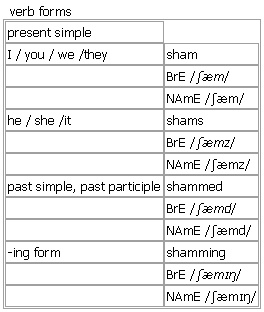 sham [sham shams shammed shamming] noun, adjective, verb BrE [ʃæm] NAmE [ʃæm]