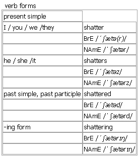 shat·ter [shattershattersshatteredshattering] BrE [ˈʃætə(r)] NAmE [ˈʃætər] verb 1. intransitive, transitive to suddenly break into small pieces; to make sth suddenly break into small pieces •~ (into sth) He dropped the vase and it shattered into pieces on the floor. •the sound of shattering glass •~ sth (into sth) The explosion shattered all the windows in the building. 2. transitive, intransitive to destroy sth completely, especially sb's feelings, hopes or beliefs; to be destroyed in this way •~ sth (into sth) Anna's self-confidence had been completely shattered. •Injury shattered his dreams of competing in the Olympics. •Her experience of divorce shattered her illusions about love. •~ (into sth) My whole world shattered into a million pieces. 3. transitive ~ sb to make sb feel extremely shocked and upset •The unexpected death of their son shattered them. Verb forms: