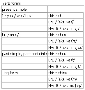 skir·mish [skirmish skirmishes skirmished skirmishing] noun, verb BrE [ˈskɜːmɪʃ] NAmE [ˈskɜːrmɪʃ] noun 1. a short fight between small groups of soldiers, etc, especially one that is not planned •Several people were killed in skirmishes during the night. 2. a short argument, especially between political opponents •a skirmish between the two party leaders Word Origin: Middle English (as a verb): from Old French eskirmiss-, lengthened stem of eskirmir, from a Germanic verb meaning ‘defend’. Example Bank: •Minor skirmishes broke out all along the border. •They were involved in a skirmish with rival fans. •a skirmish over boundaries •an opening skirmish in the protracted media battle ahead •skirmishes between the police and guerillas •There was a short skirmish between party leaders when the government announced the new tax increases. Derived Words: ↑skirmisher ▪ ↑skirmishing verb intransitive to take part in a short fight or argument Verb forms: Word Origin: Middle English (as a verb): from Old French eskirmiss-, lengthened stem of eskirmir, from a Germanic verb meaning ‘defend’. Example Bank: •The patrol skirmished with the enemy for several hours.