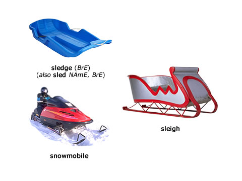 sledge [sledgesledgessledgedsledging] BrE [sledʒ] NAmE [sledʒ] (BrE) (alsosled NAmE, BrE)noun, verb noun a vehicle for travelling over snow and ice, with long narrow strips of wood or metal instead of wheels. Larger sledges are pulled by horses or dogs and smaller ones are used for going down hills as a sport or for pleasure. compare ↑sleigh, ↑toboggan