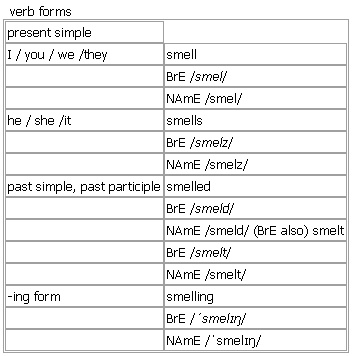 smell [smell smells smelled smelt smelling] verb, noun BrE [smel] NAmE [smel] verb (smelled, smelled)(BrE also smelt, smeltBrE [smelt] ; NAmE [smelt] ) 1. intransitive to have a particular smell •+ adj. The room smelt damp. • Dinner smells good. •a bunch of sweet-smelling flowers •~ of sth His breath smelt of garlic. •The house smelt of cedar wood and fresh polish. •~ like sth What does the perfume smell like? 2. transitive, no passive (not used in the progressive tenses; often with can or could)to notice or recognize a particular smell •~ sth He said he could smell gas when he entered the room. • The dog had smelt a rabbit. •I could smell alcohol on his breath. •~ sth doing sth Can you smell something burning? •~ (that)… I could smell that something was burning. 3. intransitive (not used in the progressive tenses; often with can or could)to be able to notice and recognize smells •I can't smell because I've got a bad cold. 4. transitive ~ sth (not usually used in the passive)to put your nose near sth and breathe in so that you can discover or identify its smell Syn: ↑sniff • Smell this and tell me what you think it is. • I bent down to smell the flowers. 5. intransitive (not used in the progressive tenses)to have an unpleasant smell • The drains smell. •It smells in here. •He hadn't washed for days and was beginning to smell. 6. transitive, no passive ~ sth to feel that sth exists or is going to happen •He smelt danger. •I can smell trouble. more at a rose by any other name would smell as sweet at ↑rose n., wake up and smell the coffee at ↑wake v. Verb forms: Word Origin: Middle English: of unknown origin. Example Bank: •After a few days, the meat began to smell. •Can you smell gas? •He smelled faintly of sweat. •His clothes smelled strongly of fish. •I had a streaming cold, so I could not smell properly. •It smells like rotten meat! •Snow fell so that you could almost smell the cold. •The kitchen smelled sweetly of herbs and fruit. •You could practically smell the danger around us. •It smells in here, can you open a window? •Those drains smell. Idioms: ↑come up of something smelling of roses ▪ ↑smell a rat Derived: ↑smell somebody out noun 1. countable, uncountable the quality of sth that people and animals sense through their noses •a faint/strong smell of garlic •a sweet/fresh/musty smell • There was a smell of burning in the air. • The smells from the kitchen filled the room. 2. singular an unpleasant smell • What's that smell? • Yuk! What a smell! 3. uncountable the ability to sense things with the nose • Dogs have a very good sense of smell. • Taste and smell are closely connected. 4. countable the act of smelling sth Syn: ↑sniff •He took one smell of the liquid and his eyes began to water. see the sweet smell of success at ↑sweet adj. Word Origin: Middle English: of unknown origin. Thesaurus: smell noun 1. C, U •Do you like the smell of coffee? scent • • aroma • • fragrance • • whiff • a smell/the scent/an aroma/the fragrance/a whiff of sth have/give off a/an smell/scent/aroma/fragrance/whiff a/an smell/scent/aroma hangs/lingers/comes/wafts somewhere 2. sing. •What's that terrible smell? reek • |BrE odour • |AmE odor • |informal stink • |especially written literary stench • a/an smell/reek/odour/stink/stench of sth a foul/powerful/putrid smell/odour/stench give off a/an smell/odour/stench Vocabulary Building: Smells Describing smells These adjectives describe pleasant smells: scented candles aromatic oils fragrant perfume sweet-smelling flowers To describe unpleasant smells you can use: smelly cheese stinking fish musty old books acrid smokeTypes of smell Pleasant smells: the rich aroma of fresh coffee a herb with a delicate fragrance a rose’s sweet perfume the scent of wild flowers Unpleasant smells: nasty household odours the stench of rotting meat the stink of stale sweat the reek of beer and tobacco Example Bank: •A delicious smell of freshly baked bread wafted across the lawn. •An acrid smell filled the air. •As she walked into the house she detected the smell of gas. •Cooking smells drifted up from the kitchen. •Deer have a keen sense of smell. •Fragrance dispensers are designed to mask unpleasant smells. •The air was filled with a pervasive smell of chemicals. •The cottage had a musty smell after being shut up over the winter. •The faint smell of her perfume hung in the air. •The sights, sounds and smells of Delhi stunned me. •The skunk gives off an unpleasant smell when attacked. •The smell was coming from the kitchen. •Then the pungent smell hit us— rotting fish and seaweed. •There was an overpowering smell of burning rubber. •What's that funny smell? •the aromatic smells of a spring garden full of herbs •the putrid smell from the slaughterhouse •the smell of smoke •the sour smell of unwashed linen •the sweet smell of roses •Do you like the smell of coffee? •See if you can get rid of that smell. •The smell of burning stubble drifted through the air. •There was a musty smell in the attic. •There was an unmistakable smell of alcohol on his breath. •What a terrible smell! •Wonderful cooking smells were coming from the kitchen.