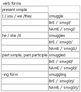 smug·gle [smugglesmugglessmuggledsmuggling] BrE [ˈsmʌɡl] NAmE [ˈsmʌɡl] verb ~ sth/sb (+ adv./prep.) to take, send or bring goods or people secretly and illegally into or out of a country, etc •They were caught smuggling diamonds into the country. •He managed to smuggle a gun into the prison. •smuggled drugs •We do not yet know how the bomb was smuggled abroad. Verb forms: