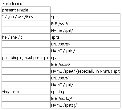 spit [spit spits spitted spitting] verb, noun BrE [spɪt] NAmE [spɪt] verb (spit·ting, spat, spatBrE [spæt] ; NAmE [spæt] spit is also sometimes used for the past tense and past participle, especially in NAmE) FROM MOUTH 1. transitive to force liquid, food, etc. out of your mouth •~ sth (out) She took a mouthful of food and then suddenly spat it out. •~ sth (from sth) He was spitting blood from a badly cut lip. 2. intransitive to force ↑saliva (= the liquid that is produced in the mouth) out of your mouth, often as a sign of anger or lack of respect •He coughed and spat. •~ at/on/in sb/sth The prisoners were spat on by their guards. •She spat in his face and went out. •A gang of youths swore and spat at officials outside the stadium. SAY STH ANGRILY 3. transitive to say sth in an angry or aggressive way •+ speech ‘You liar!’ she spat. •~ sth (at sb) He was dragged out of the court, spitting abuse at the judge and jury. OF AN ANIMAL 4. intransitive to make a short angry sound •Snakes spit and hiss when they are cornered. •The cat arched its back and spat at the dog. OF STH COOKING/BURNING 5. intransitive to make a noise and throw out fat, ↑sparks, etc •sausages spitting in the frying pan •The logs on the fire crackled and spat. RAIN 6. intransitive (informal) (only used in the progressive tenses)when it is spitting, it is raining lightly Verb forms: Word Origin: v. and n. senses 1 to 2 Old English spittan n. senses 3 to 4 Old English spitu West Germanic Dutch spit German Spiess Idioms: ↑spit and polish ▪ ↑spit it out ▪ ↑spit venom ▪ ↑within spitting distance Derived: ↑spit up noun IN/FROM MOUTH 1. uncountable the liquid that is produced in your mouth Syn: ↑saliva 2. countable, usually singular the act of spitting liquid or food out of your mouth PIECE OF LAND 3. countable a long thin piece of land that sticks out into the sea/ocean, a lake, etc •a shingle spit •a remote spit of land on the coast FOR COOKING MEAT 4. countable a long thin straight piece of metal that you put through meat to hold and turn it while you cook it over a fire •chickens roasting on a spit Word Origin: v. and n. senses 1 to 2 Old English spittan n. senses 3 to 4 Old English spitu West Germanic Dutch spit German Spiess See also: ↑within shouting distance