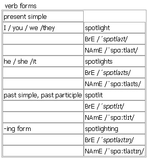verb (spot·lit, spot·litBrE [ˈspɒtlɪt] ; NAmE [ˈspɑːtlɪt] Especially in sense 2, spot • light • ed is also used for the past tense and past participle.) 1.~ sth to shine a ↑spotlight on sb/sth •a spotlit stage 2.~ sth to give special attention to a problem, situation, etc. so that people notice it Syn: ↑highlight •The programme spotlights financial problems in the health service. Verb forms:
