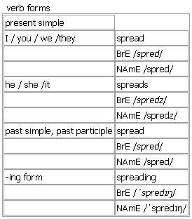 spread [spread spreads spreading] verb, noun BrE [spred] NAmE [spred] verb (spread, spread) OPEN/ARRANGE 1. transitive ~ sth (out) (on/over sth) to open sth that has been folded so that it covers a larger area than before •to spread a cloth on a table • Sue spread the map out on the floor. • The bird spread its wings. 2. transitive ~ sth (out) (on/over sth) to arrange objects so that they cover a large area and can be seen easily • Papers had been spread out on the desk. ARMS/LEGS 3. transitive ~ sth (out) to move your arms, legs, fingers, etc. far apart from each other • She spread her arms and the child ran towards her. AMONG PEOPLE 4. intransitive, transitive to affect or make sth affect, be known by, or used by more and more people •(+ adv./prep.) The disease spreads easily. • Within weeks, his confidence had spread throughout the team. •Use of computers spread rapidly during that period. •~ sth to spread rumours/lies about sb •The disease is spread by mosquitoes. COVER LARGE AREA 5. intransitive, transitive to cover, or to make sth cover, a larger and larger area •(+ adv./prep.) The fire rapidly spread to adjoining buildings. • Water began to spread across the floor. •A smile spread slowly across her face. •~ sth Using too much water could spread the stain. 6. transitive ~ sb/sth to cause sb/sth to be in a number of different places • Seeds and pollen are spread by the wind. • We have 10 000 members spread all over the country. 7. intransitive ~ (out) + adv./prep. to cover a large area •The valley spread out beneath us. SOFT LAYER 8. transitive, intransitive to put a layer of a substance onto the surface of sth; to be able to be put onto a surface •~ (A on/over B) to spread butter on pieces of toast •~ (B with A) pieces of toast spread with butter • If the paint is too thick, it will not spread evenly. DIVIDE/SHARE 9. transitive to separate sth into parts and divide them between different times or different people •~ sth Why not pay monthly and spread the cost of your car insurance? •~ sth (out) (over sth) A series of five interviews will be spread over two days. •~ sth between sb/sth We attempted to spread the workload between the departments. Verb forms: Word Origin: Old English -sprǣdan (used in combinations), of West Germanic origin; related to Dutch spreiden and German spreiten. Thesaurus: spread verb 1. T •He spread the map out on the floor. lay sth out • • lay • • unfold • • open • • unroll • spread/lay out/lay/open sth on sth spread/lay/open sth out spread out/lay out/unfold/open a map 2. T •Papers were spread out on the desk. scatter • • strew • spread/scatter/strew sth on/onto/over/across sth spread/scatter seeds 3. I, T •The disease spreads easily. pass sth on • • hand sth down • • infect • |especially spoken give • |formal transmit • spread sth/pass sth on/hand sth down/give sth/transmit sth to sb spread/pass on/infect sb with/give sb/transmit a/an disease/infection/virus spread/pass on/transmit information/a message spread/pass on/hand down knowledge 4. T, I (usually used with an adverb or preposition) •She spread butter on a piece of toast. cover • • coat • • smear • • rub • • daub • spread/cover/coat/smear/rub/daub sth with sth spread/smear/rub/daub sth on sth be spread/covered/coated with chocolate Example Bank: •Allow plenty of space for this plant as its roots spread widely. •Don't make the paste too thick, or it will not spread evenly. •Expertise in this field is very thinly spread across the country. •Friends may be spread geographically. Neighbours, by definition, are nearby. •He had a newspaper spread open on his knee. •He spread jam on the toast. •His fame had spread far and wide. •Spread each slice generously with butter. •The course takes forty hours, spread over twenty weeks. •The disease can be spread by contact. •The effects of this policy spread far beyond children now at school. •The news spread like wildfire. •We spread the rug out on the floor. •We tried to spread the workload evenly between the departments. •With four markets to manage, there's a danger that's she's spreading herself too thin. •a bird with its wings spread wide •He shuffled the cards and spread them in a fan. •If the paint is too thick, it will not spread easily. •She spread butter on a piece of toast. •Spread the cake with cream and then sprinkle flakes of chocolate on top. •The bird spread its wings and flew away. •They spread a cloth on a table. •I wish he would stop spreading lies about me. •Within weeks his confidence had spread throughout the team. Idioms: ↑spread like wildfire ▪ ↑spread the word ▪ ↑spread your net ▪ ↑spread your wings ▪ ↑spread yourself too thin Derived: ↑spread out ▪ ↑spread yourself out noun INCREASE 1. uncountable an increase in the amount or number of sth that there is, or in the area that is affected by sth •to prevent the spread of disease •to encourage the spread of information • Shut doors to delay the spread of fire. •the spread of a city into the surrounding areas see also ↑middle-age spread RANGE/VARIETY 2. countable, usually singular a range or variety of people or things •a broad spread of opinions • There was a good spread of scores on the test. ON BREAD 3. countable, uncountable a soft food that you put on bread • Use a low-fat spread instead of butter. •cheese spread AREA COVERED 4. countable, usually singular ~ (of sth) the area that sth exists in or happens in •The company has a good geographical spread of hotels in this country. 5. countable, usually singular ~ (of sth) how wide sth is or the area that sth covers •The bird's wings have a spread of nearly a metre. IN NEWSPAPER/MAGAZINE 6. countable an article or advertisement in a newspaper or magazine, especially one that covers two opposite pages •The story continued with a double-page s