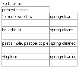 ˌspring-ˈclean [spring-clean spring-cleans spring-cleaned spring-cleaning] BrE NAmE verb transitive, intransitive ~ (sth) to clean a house, room, etc. thoroughly, including the parts you do not usually clean •Fran decided to spring-clean the apartment. Derived Word: ↑spring clean Verb forms: