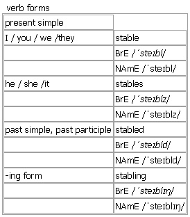 verb ~ sth to put or keep a horse in a stable • Where do you stable your pony? Verb forms: