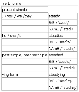 steady [steady steadies steadied steadying] adjective, verb, adverb, exclamation BrE [ˈstedi] NAmE [ˈstedi] adjective (stead·ier, steadi·est) 1. developing, growing, etc. gradually and in an even and regular way Syn: ↑constant •five years of steady economic growth •a steady decline in numbers • We are making slow but steady progress. • The castle receives a steady stream of visitors. 2. not changing and not interrupted Syn: ↑regular • His breathing was steady. •a steady job/income • She drove at a steady 50 mph. •They set off at a steady pace. •a steady boyfriend/girlfriend (= with whom you have a serious relationship or one that has lasted a long time) •to have a steady relationship 3. firmly fixed, supported or balanced; not shaking or likely to fall down • He held the boat steady as she got in. • I met his steady gaze. •Such fine work requires a good eye and a steady hand. •She's not very steady on her feet these days. Opp: ↑unsteady 4. (of a person)sensible; who can be relied on more at ready, steady, go! at ↑ready adj. Word Origin: Middle English (in the sense ‘unwavering, without deviation’): from ↑stead + ↑-y. The verb dates from the mid 16th cent. Thesaurus: steady adj. 1. •She made slow but steady progress. regular • • constant • • consistent • • unchanging • • even • |usually approving stable • |sometimes disapproving, especially business static • a/an steady/constant/even/stable temperature a steady/constant/consistent trend/rate (a) steady/regular/stable relationship/employment Steady or regular? Both these words can be used to describe a job, work, employment, an income, the supply of sth or a relationship that continues for a long time and that you can rely on. A regular job is sometimes used in contrast to another job that is not regular: •I decided to give up the freelance work and concentrate on my regular job. ✗ I decided to concentrate on my steady job.: •If you want money, get a regular/steady job. 2. •The work requires a steady hand. stable • • firm • • secure • Opp: unsteady a steady/stable/firm/secure foundation Example Bank: •Hold the ladder steady! •Inflation seems to be holding steady. •Share prices have held steady over the last few days. •She opened the letter with hands that were not quite steady. •She's got a steady boyfriend. •Such fine work requires a good eye and a steady hand. •The last decade has seen a steady decline in the number of birds nesting here. •The new position would provide him with a steady income. •They wanted me to get a steady job. •We've had five years of steady economic growth. Idioms: ↑go steady ▪ ↑steady as a rock Derived Words: ↑steadily ▪ ↑steadiness verb (stead·ies, steady·ing, stead·ied, stead·ied) 1. transitive, intransitive ~ (yourself/sb/sth) to stop yourself/sb/sth from moving, shaking or falling; to stop moving, shaking or falling •She steadied herself against the wall. •The lift rocked slightly, steadied, and the doors opened. 2. intransitive to stop changing and become regular again •Her heartbeat steadied. •~ against sth The pound steadied against the dollar. 3. transitive ~ sb/sth to make sb/sth calm •He took a few deep breaths to steady his nerves. Verb forms: Word Origin: Middle English (in the sense ‘unwavering, without deviation’): from ↑stead + ↑-y. The verb dates from the mid 16th cent. Example Bank: •The elevator rocked slightly, steadied, and the doors opened. adverb in a way that is steady and does not change or shake •In trading today the dollar held steady against the yen. Word Origin: Middle English (in the sense ‘unwavering, without deviation’): from ↑stead + ↑-y. The verb dates from the mid 16th cent. exclamation (informal) 1. ~ on (becoming old-fashioned)used to tell sb to be careful about what they are saying or doing, for example because it is extreme or not appropriate •Steady on! You can't say things like that about somebody you've never met. 2. used to tell sb to be careful •Steady! Don't fall off. Word Origin: Middle English (in the sense ‘unwavering, without deviation’): from ↑stead + ↑-y. The verb dates from the mid 16th cent.
