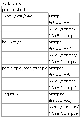 stomp [stomp stomps stomped stomping] BrE [stɒmp] NAmE [stɑːmp] NAmE [stɔːmp] verb intransitive + adv./prep. (informal) to walk, dance, or move with heavy steps •She stomped angrily out of the office. •The children were stomping around noisily. Verb forms: Word Origin: early 19th cent. (originally US dialect): variant of the verb ↑stamp. Example Bank: •I could hear my mother stomping around in the other room. •She stomped angrily up the stairs.