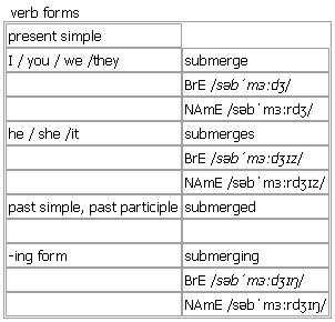 sub·merge [submerge submerges submerged submerging] BrE [səbˈmɜːdʒ] NAmE [səbˈmɜːrdʒ] verb 1. intransitive, transitive to go under the surface of water or liquid; to put sth or make sth go under the surface of water or liquid •The submarine had had time to submerge before the warship could approach. •~ sth The fields had been submerged by floodwater. 2. transitive ~ sth to hide ideas, feelings, opinions, etc. completely •Doubts that had been submerged in her mind suddenly resurfaced. Derived Words: ↑submerged ▪ ↑submersion Verb forms: Word Origin: early 17th cent.: from Latin submergere, from sub- ‘under’ + mergere ‘to dip’. Example Bank: •Hippopotamuses cool down by submerging themselves in water. •The fields had been submerged by flood water. Example Bank: •The car was submerged under 20 feet of water. •The machine can be totally submerged in water. •barely submerged antagonism