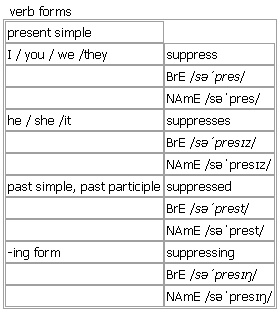sup·press [suppress suppresses suppressed suppressing] BrE [səˈpres] NAmE [səˈpres] verb 1. ~ sth (usually disapproving) (of a government, ruler, etc.)to put an end, often by force, to a group or an activity that is believed to threaten authority Syn: ↑quash •The rebellion was brutally suppressed. 2. ~ sth (usually disapproving)to prevent sth from being published or made known •The police were accused of suppressing vital evidence. 3. ~ sth to prevent yourself from having or expressing a feeling or an emotion •to suppress a smile •She was unable to suppress her anger. •He had suppressed the painful memories of his childhood. 4. ~ sth to prevent sth from growing, developing or continuing •drugs that suppress the appetite Verb forms: Word Origin: late Middle English: from Latin suppress- ‘pressed down’, from the verb supprimere, from sub- ‘down’ + premere ‘to press’. Example Bank: •He could hardly suppress his surprise. •He could no longer suppress his anger. •Her face was charged with barely suppressed anger. •She was unable to suppress a giggle. •The disloyal thought was instantly suppressed. •The medication effectively suppressed the pain. •They often use violence to suppress opposition. •This information had been deliberately suppressed. •A 5 cm layer will suppress weed growth. •He couldn't suppress the excitement in his voice. •Slimming drugs do help to suppress appetite. •The government sought to suppress a growing armed separatist movement. •The regime ruthlessly suppresses all dissent. •The strike was violently suppressed by the army. •Trade union rights were suppressed and casual work became the norm. •Transplant patients take drugs which suppress the immune system.