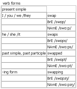 swap [swap swaps swapped swapping] (also swop)verb, noun BrE [swɒp] NAmE [swɑːp] verb (-pp-) 1. intransitive, transitive to give sth to sb and receive sth in exchange •~ (sth) (with sb) I've finished this magazine. Can I swap with you? •~ sth for sth I swapped my red scarf for her blue one. •~ sth Can we swap places? I can't see the screen. •We spent the evening in the pub swapping stories (= telling each other stories) about our travels. •~ sb sth for sth I swapped him my CD for his posters. 2. intransitive ~ (over) to start doing sb else's job, etc. while they do yours •I'll drive there and then we'll swap over on the way back. 3. transitive (especially BrE)to replace one person or thing with another •~ sb/sth (for sb/sth) I think I'll swap this sweater for one in another colour. •~ sb/sth (over) I'm going to swap you over. Mike will go first and Jon will go second. see change/swap places at ↑place n. Verb forms: Word Origin: Middle English (originally in the sense ‘throw forcibly’): probably imitative of a resounding blow. Current senses have arisen from an early use meaning ‘strike hands as a token of agreement’. Example Bank: •Can we swap places? I can't see the screen. •I think I'll swap this sweater for one in another colour. •I'll drive there and then we'll swap over on the way back. •I've finished this magazine. Can I swap with you? •We spent the evening in the bar swapping stories about our travels. noun 1. usually singular an act of exchanging one thing or person for another •Let's do a swap. You work Friday night and I'll do Saturday. 2. a thing or person that has been exchanged for another •Most of my football stickers are swaps. Word Origin: Middle English (originally in the sense ‘throw forcibly’): probably imitative of a resounding blow. Current senses have arisen from an early use meaning ‘strike hands as a token of agreement’. Example Bank: •Let's do a straight swap— your guitar for my bike. •The football managers agreed on swap deals involving their star players. •a spy swap made between East and West Germany •Let's do a swap. You work Friday night and I'll do Saturday. •Why not arrange a job swap with someone in another city or state? See also: ↑swop