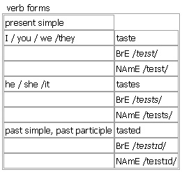 ▪ I. taste [taste tastes tasted tasting] noun, verb BrE [teɪst] NAmE [teɪst] noun FLAVOUR 1. countable, uncountable the particular quality that different foods and drinks have that allows you to recognize them when you put them in your mouth •a salty/bitter/sweet, etc. taste • I don't like the taste of olives. • This dish has an unusual combination of tastes and textures. •The soup has very little taste. SENSE 2. uncountable the sense you have that allows you to recognize different foods and drinks when you put them in your mouth • I've lost my sense of taste. SMALL QUANTITY 3. countable, usually singular a small quantity of food or drink that you try in order to see what it is like • Just have a taste of this cheese. • Do you want a taste? SHORT EXPERIENCE 4. singular a short experience of sth •This was my first taste of live theatre. •Although we didn't know it, this incident was a taste of things to come. ABILITY TO CHOOSE WELL 5. uncountable a person's ability to choose things that people recognize as being of good quality or appropriate • He has very good taste in music. • They've got more money than taste. •The room was furnished with taste. WHAT YOU LIKE 6. countable, uncountable what a person likes or prefers •~ (for sth) That trip gave me a taste for foreign travel. •~ (in sth) She has very expensive tastes in clothes. •The colour and style is a matter of personal taste. •Modern art is not to everyone's taste. •There are trips to suit all tastes. more at there's no accounting for taste at ↑account v., an acquired taste at ↑acquire, a taste/dose of your own medicine at ↑medicine Word Origin: Middle English (also in the sense ‘touch’): from Old French tast (noun), taster (verb) ‘touch, try, taste’, perhaps based on a blend of Latin tangere ‘to touch’ and gustare ‘to taste’. Example Bank: •Art is an acquired taste— no one is born knowing that Michelangelo is wonderful. •Contemporary arbiters of taste dismissed his paintings as rubbish. •Don't have a cigarette now— you'll spoil the taste of your food! •Have a taste of this cake. •He could feel the taste of blood in his mouth. •Her choice of outfit demonstrated her taste for the outrageous. •Her music appeals to popular taste. •Her work is executed with impeccable taste. •His tastes run to the exotic. •I had a strong coffee to take away the nasty taste of the food. •I've lost my taste for exotic trips. •If fishing is not to your taste, there are many other leisure activities on offer. •It all depends on where your tastes lie. •Lifestyles differ and tastes vary. •Modern art is an acquired taste. •Now he is retired he has time to indulge his tastes for writing and politics. •People with a taste for complex plots will enjoy this book. •She has terrible taste in clothing. •She savoured the taste of the champagne. •That job gave me my first real taste of teaching. •That joke was in very poor taste. •The designer has exercised good taste in her choice of fabrics. •The drink left a bitter taste in his mouth. •The film was judged to offend against standards of public taste and decency. •The house reflected his taste. •The love scenes are all done in the best possible taste. •The music was too modern for my taste. •The new appraisal plan is only a taste of things to come. •The remark showed a deplorable lack of taste. •The room had been decorated with great taste. •The soup had a very salty taste. •The whole business left a bad taste in my mouth. •They have a taste for adventure. •This was her first taste of success. •What type of bicycle you should buy is very much a matter of personal taste. •You need to use fresh herbs to get the authentic Italian taste. •You obviously share her taste in reading. •a man of advanced tastes •a range of hotels to suit all tastes and budgets •the changing tastes of consumers •young people's tastes in music •He has an unusual taste in music. •Modern art is not to everyone's taste. •Salt stimulates the taste buds on the tongue. •She has a real taste for adventure/designer clothes. •She has a very expensive taste in clothes. •The colour and style is a matter of personal taste. •The soup doesn't have much taste. •They've got more money than taste. Idioms: in bad/poor/the worst possible taste ▪ in good/the best possible taste ▪ ↑leave a bad taste in the mouth verb (not used in the progressive tenses) HAVE FLAVOUR 1. linking verb to have a particular flavour •+ adj. It tastes sweet. •~ of sth The ice tasted of mint. •~ like sth This drink tastes like sherry. 2. -tasting (in adjectives)having a particular flavour •foul-tasting medicine RECOGNIZE FLAVOUR 3. transitive ~ sth (often used with can or could)to be able to recognize flavours in food and drink • You can taste the garlic in this stew. • I can't really taste anything with this cold. TEST FLAVOUR 4. transitive ~ sth to test the flavour of sth by eating or drinking a small amount of it Syn: ↑try • Taste it and see if you think there's enough salt in it. EAT/DRINK 5. transitive ~ sth to eat or drink food or liquid • I've never tasted anything like it. HAVE SHORT EXPERIENCE 6. transitive ~ sth to have a short experience of sth, especially sth that you want more of • He had tasted freedom only to lose it again. Verb forms: Word Origin: Middle English (also in the sense ‘touch’): from Old French tast (noun), taster (verb) ‘touch, try, taste’, perhaps based on a blend of Latin tangere ‘to touch’ and gustare ‘to taste’. Example Bank: •The fish tasted faintly of garlic. •The fruit tasted rather like mango. •The water tasted strongly of chemicals. •a cake which tasted of almonds •I haven't tasted meat since I started the journey. •I've never tasted anything like it. •Taste it and see if you think there's enough salt in it. •Would you like to taste the wi