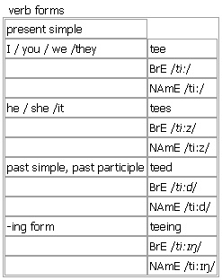 tee [tee tees teed teeing] noun, verb BrE [tiː] NAmE [tiː] noun 1. a flat area on a ↑golf course from which players hit the ball •to drive off from the first tee •a tee shot 2. a small piece of plastic or wood that you stick in the ground to support a ↑golf ball before you hit it see to a T/tee at ↑T Derived: ↑tee off ▪ ↑tee somebody off ▪ ↑tee something up ▪ ↑tee up verb (teed, teed) Verb forms: