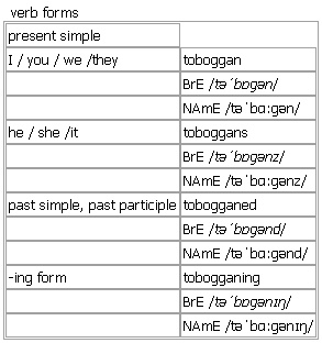 to·bog·gan [toboggan toboggans tobogganed tobogganing] noun, verb BrE [təˈbɒɡən] NAmE [təˈbɑːɡən] noun a long light narrow ↑sledge (= a vehicle that slides over snow) sometimes curved up in front, used for sliding down slopes Word Origin: early 19th cent.: from Canadian French tabaganne, from Micmac (an Algonquian language) topaĝan ‘sled’. Derived Word: ↑tobogganing verb intransitive to travel down a slope on snow or ice using a ↑toboggan Verb forms: Word Origin: early 19th cent.: from Canadian French tabaganne, from Micmac (an Algonquian language) topaĝan ‘sled’.