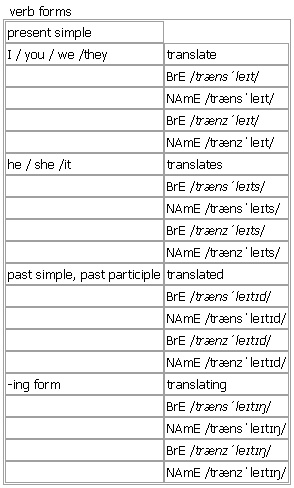 trans·late [translate translates translated translating] BrE [trænsˈleɪt] NAmE [trænsˈleɪt] BrE [trænzˈleɪt] NAmE [trænzˈleɪt] verb 1. transitive, intransitive to express the meaning of speech or writing in a different language •~ sth (from sth) (into sth) He translated the letter into English. • Her books have been translated into 24 languages. •Can you help me translate this legal jargon into plain English? •~ sth (as sth) ‘Suisse’ had been wrongly translated as ‘Sweden’. •~ (from sth) (into sth) I don't speak Greek so Dina offered to translate for me. •My work involves translating from German. 2. intransitive to be changed from one language to another • Most poetry does not translate well. •~ as sth The Welsh name translates as ‘Land's End’. 3. transitive, intransitive to change sth, or to be changed, into a different form •~ sth (into sth) It's time to translate words into action. •~ into sth I hope all the hard work will translate into profits. 4. transitive, intransitive ~ (sth) (as sth) to understand sth in a particular way or give sth a particular meaning Syn: ↑interpret •the various words and gestures that we translate as love Verb forms: Word Origin: Middle English: from Latin translat- ‘carried across’, past participle of transferre, from trans- ‘across’ + ferre ‘to bear’. Example Bank: •‘Tiramisu’ literally translates as ‘pull-me-up’. •A small increase in local spending will translate into a big rise in council tax. •Higher sales won't necessarily translate into profits. •I don't speak Italian— can you translate for me? •Teacher expectations do not automatically translate themselves into student results. •The book has been translated from the Japanese by Livia Yamaguchi. •The group attempts to translate these ideas into action. •The lost trade revenue ultimately translated into job losses at home. •The novel has been widely translated. •The story translates well to the screen. •The word ‘sensus’ can be translated as ‘feeling’. •They tried to translate the theory into simple concepts. •This word is difficult to translate. •a Greek word variously translated as ‘summit’, ‘top’ and ‘finishing stroke’ •an expression that is difficult to translate into English •I'm not sure how well the American system would translate to a European context. •It's time to translate words into action. •Most attempts to translate Shakespeare to the small screen are not successful. •You need to translate your ideas into practice/your enthusiasm into success.
