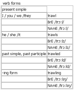 trawl [trawl trawls trawled trawling] verb, noun BrE [trɔːl] NAmE [trɔːl]
