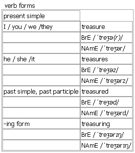 treas·ure [treasure treasures treasured treasuring] noun, verb BrE [ˈtreʒə(r)] NAmE [ˈtreʒər] noun 1. uncountable a collection of valuable things such as gold, silver and jewellery •buried treasure •a pirate's treasure chest 2. countable, usually plural a highly valued object •the priceless art treasures of the Uffizi Gallery 3. singular a person who is much loved or valued •Liz is an absolute treasure— I couldn't do without her. Word Origin: Middle English: from Old French tresor, based on Greek thēsauros ‘storehouse, treasure’. Example Bank: •Many forgotten treasures have been discovered in the attics of old houses. •This book is a treasure house of information on Arctic birds. •a vast treasure of medieval manuscripts verb ~ sth to have or keep sth that you love and that is extremely valuable to you Syn: ↑cherish •I treasure his friendship. •This ring is my most treasured possession. •I shall always treasure the memory of our time together. Verb forms: Word Origin: Middle English: from Old French tresor, based on Greek thēsauros ‘storehouse, treasure’. Example Bank: •Thank you for the watch. I will really treasure it. •memories that I will treasure for the rest of my days