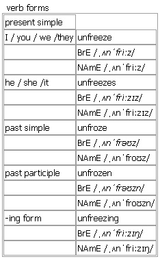 un·freeze [unfreeze unfreezes unfroze unfreezing unfrozen] BrE [ˌʌnˈfriːz] NAmE [ˌʌnˈfriːz] verb (un·frozeBrE [ˌʌnˈfrəʊz] ; NAmE [ˌʌnˈfroʊz] un·frozenBrE [ˌʌnˈfrəʊzn] ; NAmE [ˌʌnˈfroʊzn] ) 1. transitive, intransitive ~ (sth) if you unfreeze sth that has been frozen or very cold, or it unfreezes, it melts or warms until it reaches a normal temperature compare ↑defrost, ↑de-ice, ↑thaw 2. transitive ~ sth to remove official controls on money or an economy •The party plans to unfreeze some of the cash held by local government. Opp: ↑freeze Verb forms: