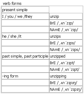 unzip [unzip unzips unzipped unzipping] BrE [ˌʌnˈzɪp] NAmE [ˌʌnˈzɪp] verb (-pp-) 1. transitive, intransitive ~ (sth) if you unzip a piece of clothing, a bag, etc, or if it unzips, you open it by undoing the ↑zip that fastens it Opp: ↑zip up 2. transitive ~ sth (computing)to return a file to its original size after it has been compressed (= made smaller) Syn: ↑decompress, Opp: ↑zip Verb forms: Example Bank: •She unzipped his jacket, as if he were a child. •The bag unzips at the side.