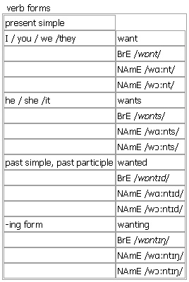 want [want wants wanted wanting] verb, noun BrE [wɒnt] NAmE [wɑːnt] NAmE [wɔːnt] verb transitive (not usually used in the progressive tenses) WISH 1. to have a desire or a wish for sth •~ sth Do you want some more tea? • She's always wanted a large family. •All I want is the truth. •Thanks for the present— it's just what I wanted. •I can do whatever I want. •The last thing I wanted was to upset you. •The party wants her as leader. •~ (to do sth) What do you want to do tomorrow? •‘It's time you did your homework.’ ‘I don't want to!’ •There are two points which I wanted to make. •I just wanted to know if everything was all right. • (informal)You can come too, if you want. •~ sb/sth to do sth Do you want me to help? •We didn't want this to happen. •I want it (to be) done as quickly as possible. Notice that you cannot say ‘want that…’: I want that you do it quickly. When the infinitive is used after want, it must have to: I want study in America. •~ sb/sth doing sth I don't want you coming home so late. •~ sb/sth + adj. Do you want your coffee black or white? NEED 2. (informal)to need sth •~ sth We'll want more furniture for the new office. • What this house wants is a good clean. •It wants a special sort of person for that job. •~ doing sth The plants want watering daily. •~ to be/have sth The plants want to be watered daily. 3. usually passive ~ sb (+ adv./prep.) to need sb to be present in the place or for the purpose mentioned • She's wanted immediately in the director's office. • Excuse me, you're wanted on the phone. see also ↑wanted SHOULD/OUGHT TO 4. ~ to do sth (informal)used to give advice to sb, meaning ‘should’ or ‘ought to’ •If possible, you want to avoid alcohol. •He wants to be more careful. •You don't want to do it like that. FEEL SEXUAL DESIRE 5. ~ sb to feel sexual desire for sb LACK 6. ~ sth (formal)to lack sth Syn: short of •He doesn't want courage. more at want none of sth at ↑none pron., have/play/take/want no part in/of sth at ↑part n., have/want no truck with sb/sth at ↑truck n., waste not, want not at ↑waste v., have/want it both ways at ↑way n. Verb forms: Word Origin: Middle English: the noun from Old Norse vant, neuter of vanr ‘lacking’; the verb from Old Norse vanta ‘be lacking’. The original notion of “lack” was early extended to “need” and from this developed the sense ‘desire’. More About: offers and invitations Would you like…? is the most usual polite question form for offers and invitations, especially in BrE: ▪ Would you like a cup of coffee? Do you want…? is less formal and more direct. It is more common in NAmE than in BrE: ▪ We’re going to a club tonight. Do you want to come with us? Would you care…? is very formal and now sounds old-fashioned. Example Bank: •All I want is the truth. •I just want you to be happy. •If you truly want to help, just do as I say. •Thanks for the present— it's just what I've always wanted. •‘I want you so much,’ she whispered in his ear. •‘It's time you did your homework.’ ‘I don't want to!’ •Alice, please don't leave me. I want you. I need you. I can't live without you. •Excuse me, you're wanted on the phone. •I don't want you coming home so late. •I want it done quickly. •I want to study in America. •I want you to do it quickly. •She's always wanted a large family. •She's wanted immediately in the director's office. •The last thing a wanted was to upset you. •We didn't want this to happen. •We'll want more furniture for the new office. •You can come too, if you want. Idioms: ↑for want of something ▪ ↑in want of something ▪ ↑not for want of doing something ▪ ↑not want to know ▪ ↑want rid of somebody ▪ ↑what do you want? Derived: ↑want for something ▪ ↑want in ▪ ↑want in something ▪ ↑want out ▪ ↑want out of something ▪ ↑want something out of somebody noun (formal) STH YOU NEED 1. countable, usually plural something that you need or want •She spent her life pandering to the wants of her children. LACK 2. uncountable, singular ~ of sth (formal)a situation in which there is not enough of sth; a lack of sth •a want of adequate medical facilities BEING POOR 3. uncountable (formal)the state of being poor, not having food, etc •Visitors to the slums were clearly shocked to see so many families living in want. Word Origin: Middle English: the noun from Old Norse vant, neuter of vanr ‘lacking’; the verb from Old Norse vanta ‘be lacking’. The original notion of “lack” was early extended to “need” and from this developed the sense ‘desire’. Example Bank: •Society can't satisfy all human wants. •Thousands of children are living in want. •a society that satisfied all human wants •The snail does not need to travel far to satisfy all its bodily wants. •There is a want of adequate medical facilities. •We call our music ‘postmodern’ for want of a better word.
