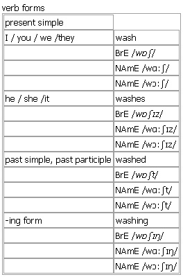 wash [wash washes washed washing] verb, noun BrE [wɒʃ] NAmE [wɑːʃ] NAmE [wɔːʃ] verb 1. transitive to make sth/sb clean using water and usually soap •~ sth/sb These jeans need washing. •to wash the car •to wash your hands • Wash the fruit thoroughly before eating. •~ sth from sth She washed the blood from his face. •~ sth/sb + adj. The beach had been washed clean by the tide. 2. intransitive, transitive (especially BrE)to make yourself clean using water and usually soap • I washed and changed before going out. •~ yourself She was no longer able to wash herself. 3. intransitive (+ adv./prep.) (of clothes, cloth, etc.)to be able to be washed without losing colour or being damaged •This sweater washes well. 4. intransitive, transitive (of water)to flow or carry sth/sb in a particular direction •+ adv./prep. Water washed over the deck. •~ sth/sb + adv./prep. Pieces of the wreckage were washed ashore. •He was washed overboard by a huge wave. Verb forms: Word Origin: Old English wæscan (verb), of Germanic origin; related to Dutch wassen, German waschen, also to ↑water. Synonyms: clean wash • rinse • cleanse • dry-clean These words all mean to remove dirt from sth, especially by using water and/or soap. clean • to remove dirt or dust from sth, especially by using water or chemicals: ▪ The villa is cleaned twice a week. ◇ ▪ Have you cleaned your teeth? ◇ ▪ This coat is filthy. I'll have it cleaned ▪ (= dry-cleaned). wash • to remove dirt from sth using water and usually soap: ▪ He quickly washed his hands and face. ◇ ▪ These jeans need washing. rinse • to remove dirt, etc. from sth using clean water only, not soap; to remove the soap from sth with clean water after washing it: ▪ Make sure you rinse all the soap out. cleanse • to clean your skin or a wound. dry-clean • to clean clothes using chemicals instead of water. to clean/wash/rinse/cleanse sth in/with sth to clean/wash/rinse sth from sth to clean/wash/cleanse a wound to clean/wash the car/floor to wash/rinse your hair to have sth cleaned/washed/dry-cleaned Example Bank: •Hands need to be washed regularly with hot water. •She gently washed and dressed the wound. •the smell of freshly washed hair •He always washes the car on Sundays. •He quickly washed his hands and face. •He washed his face. •If you wash the dishes, I'll dry. •She washed out the empty bottles. Idioms: ↑it will come out in the wash ▪ ↑something won't wash ▪ ↑wash your dirty linen in public ▪ ↑wash your hands of somebody Derived: ↑wash off ▪ ↑wash out ▪ ↑wash over somebody ▪ ↑wash somebody away ▪ ↑wash something down ▪ ↑wash something off ▪ ↑wash something out ▪ ↑wash something up ▪ ↑wash up noun 1. countable, usually singular (especially BrE)an act of cleaning sb/sth using water and usually soap •These towels are ready for a wash. •I'll just have a quick wash before dinner. •The curtains could do with a good (= thorough) wash. •I'm doing a dark wash (= washing all the dark clothes together). •Your shirt's in the wash (= being washed or waiting to be washed). •My sweater shrank in the wash. •That blouse shouldn't look like that after only two washes. see also ↑car wash 2. the washsingular an area of water that has waves and is moving a lot, especially after a boat has moved through it; the sound made by this •The dinghy was rocked by the wash of a passing ferry. •They listened to the wash of waves on the beach. •Seagulls hovered above the wash of the trawler. 3. countable a thin layer of a liquid, especially paint, that is put on a surface •The walls were covered with a pale yellow wash. see also ↑whitewash 4. countable, uncountable a liquid containing soap, used for cleaning your skin •an antiseptic skin wash see also ↑mouthwash Word Origin: Old English wæscan (verb), of Germanic origin; related to Dutch wassen, German waschen, also to ↑water. Example Bank: •I'm doing a dark wash. •That car could do with a good wash. •This will all come out in the wash. •Your shirt's in the wash. •I'll just have a quick wash before dinner. •That blouse shouldn't look like that after only two washes. See also: ↑do the dishes ▪ ↑wash through somebody
