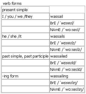 was·sail 7 [wassail wassails wassailed wassailing] BrE [ˈwɒseɪl] NAmE [ˈwɑːseɪl] verb (old use) 1. intransitive to enjoy yourself by drinking alcohol with others 2. intransitive to go from house to house at Christmas time singing ↑carols Derived Word: ↑wassailer Verb forms: Word Origin: Middle English wæs hæil ‘be in (good) health!’: from Old Norse ves heill (compare with the verb ↑hail). The drinking formula wassail (and the reply drinkhail ‘drink good health’) were probably introduced by Danish-speaking inhabitants of England, and then spread, so that by the 12th cent. the usage was considered by the Normans to be characteristic of Englishmen. Culture: carols and carol singing Carols are traditional songs that are sung just before ↑Christmas. Many of them celebrate the birth of Jesus Christ. Carols were first sung in the 14th century. They were popular songs with a lively tune, and contained references to the celebrations and feeling of goodwill associated with Christmas, as well as to Christ’s birth. One of the oldest printed carols, dating from 1521, is the Boar’s Head Carol, which was sung in Queen’s College, ↑Oxford as Christmas lunch was carried in. Other traditional carols that are thought to have originated at this time include ↑God Rest You Merry, Gentlemen and ↑While Shepherds Watched Their Flocks by Night. In England during the 16th century, the Puritans tried to stop people singing carols, but the words continued to be handed down from one generation to the next. In the 19th century many of these carols were collected and printed. Some tunes were taken from ↑folk songs, others were specially written. Many of the most popular carols heard today date from this time. They include ↑O Come, All Ye Faithful, ↑Hark! the Herald Angels Sing, ↑Good King Wenceslas, ↑Away in a Manger and ↑O Little Town of Bethlehem. Traditional carols are very popular in Britain and America, but children also like more modern songs, such as ↑Rudolph, the Red-nosed Reindeer, about how a reindeer’s bright red nose lights the way for ↑Santa Claus to take toys to children during a storm, and Frosty the Snowman, which tells the story of a figure made of snow who comes to life. In the 19th century groups of carol singers, called waits, used to gather in the streets to play and sing for local people, who thanked them by offering drinks or mince pies (= small round pies containing dried fruit, apples and sugar). This custom became known as wassailing and still continues in Britain, with people meeting to sing carols in most town and village centres. Any money that is collected is given to charity. Some singers walk from street to street, singing carols outside each house. In the US door-to-door carol singing is not common, except in a few small communities. Families sing carols when they decorate the Christmas tree. Carols are also sung in churches and, in Britain, in schools, in special Christmas services. One of the most famous carol services is the ↑Festival of Nine Lessons and Carols, which is performed at ↑King's College, Cambridge, and broadcast on ↑BBC radio on Christmas Eve.