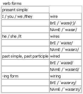 wire [wire wires wired wiring] noun, verb BrE [ˈwaɪə(r)] NAmE [ˈwaɪər] noun 1. uncountable, countable metal in the form of thin thread; a piece of this •a coil of copper wire •a wire basket • The box was fastened with a rusty wire. see also ↑barbed wire, ↑high wire, ↑tripwire 2. countable, uncountable a piece of wire that is used to carry an electric current or signal •overhead wires •fuse wire • The telephone wires had been cut. see also ↑hot-wire 3. the wiresingular a wire fence • Three prisoners escaped by crawling under the wire. 4. countable (informal, especially NAmE) = ↑telegram •We sent a wire asking him to join us. see also ↑wiry more at a live wire at ↑live 2, pull wires (for sb) at ↑pull v. Word Origin: Old English wīr; of Germanic origin, probably from the base of Latin viere ‘plait, weave’. Example Bank: •Behind the wire, the prisoners were exercising. •Cool the cakes on a wire rack. •Don't place carpets over electrical wires. •Don't touch that wire. It's live. •He disconnected the wire from the clock. •I found myself tripping over a tangle of wires and cables. •One man rode a bicycle along the high wire as the climax to the act. •Surely the wires shouldn't show like that? •The electrician ran a wire from the kitchen to the bedroom. •The wire was attached to a pin in the plug. •The wire was stretched between two poles. •There were wires trailing everywhere. •They cut the perimeter wire and escaped. •Watch out for bare wires. •We got in under the wire. •Where does this wire go? •a fence topped with razor wire •coils of barbed wire •overhead electricity wires •the flow of electrical current down a wire •wire coat hangers •a spider's web of unsightly overhead wires •a wire rack/basket Idioms: ↑get your wires crossed ▪ go/come down to the wire verb 1. ~ sth (up) to connect a building, piece of equipment, etc. to an electricity supply using wires •Make sure the plug is wired up correctly. 2. ~ sb/sth up (to sth) | ~ sb/sth to sth to connect sb/sth to a piece of equipment, especially a ↑tape recorder or computer system •He was wired up to a police tape recorder. •The microphone was wired to a loudspeaker. 3. ~ sth (for sth) to put a special device somewhere in order to listen secretly to other people's conversations Syn: ↑bug •The room had been wired for sound. 4. (especially NAmE)to send sb a message by ↑telegram •~ sth (to sb) He wired the news to us. •~ sb (sth) He wired us the news. 5. to send money from one bank to another using an electronic system •~ sth (to sb) The bank wired the money to her. •~ sb sth The bank wired her the money. 6. ~ sth to join things together using wire Verb forms: Word Origin: Old English wīr; of Germanic origin, probably from the base of Latin viere ‘plait, weave’. Example Bank: •Many homes were wired for lighting only. •She was wired up to a heart monitor. •The Christmas tree lights are all wired to one plug. •The components have to be wired together in a certain way. •We're genetically wired to love sugar. •You should check that the socket is correctly wired.
