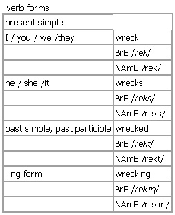 wreck [wreck wrecks wrecked wrecking] noun, verb BrE [rek] NAmE [rek] noun 1. a ship that has sunk or that has been very badly damaged see also ↑shipwreck 2. a car, plane, etc. that has been very badly damaged in an accident •Two passengers are still trapped in the wreck. •She was pulled from the burning wreck by firefighters. 3. usually singular (informal)a person who is in a bad physical or mental condition •Physically, I was a total wreck. •The experience left her an emotional wreck. •The interview reduced him to a nervous wreck. 4. (informal)a vehicle, building, etc. that is in very bad condition •The house was a wreck when we bought it. • (figurative)They still hoped to salvage something from the wreck of their marriage. 5. (NAmE) = ↑crash •a car/train wreck Word Origin: Middle English (as a legal term denoting wreckage washed ashore): from Anglo-Norman French wrec, from the base of Old Norse reka ‘to drive’; related to ↑wreak. Example Bank: •Explosions ripped through the blazing wreck. •Heavy seas prevented salvage teams from landing on the wreck. •His attempts at damage control are like watching a car wreck. •I always turn into a gibbering wreck at interviews. •I hadn't slept for two days, and I felt a complete physical wreck. •The campaign is a train wreck waiting to happen. •The interview reduced him to a nervous wreck. •They are worried about the oil still in the wreck. •They're going to try and raise the wreck from the sea bed. •the wreck of the Titanic •The wreck occurred at milepost 534, just west of Greenup, Kentucky. verb 1. ~ sth to damage or destroy sth •The building had been wrecked by the explosion. •The road was littered with wrecked cars. 2. ~ sth (for sb) to spoil sth completely •The weather wrecked all our plans. •A serious injury nearly wrecked his career. 3. usually passive ~ sth to damage a ship so much that it sinks or can no longer sail •The ship was wrecked off the coast of France. see also ↑shipwreck Verb forms: Word Origin: Middle English (as a legal term denoting wreckage washed ashore): from Anglo-Norman French wrec, from the base of Old Norse reka ‘to drive’; related to ↑wreak. Example Bank: •A bomb completely wrecked the building. •a crisis that threatens to wreck the peace talks •A serious injury in 2006 threatened to wreck his career. •His affair wrecked our marriage. •Their lives had been wrecked by neglect and abuse. •youths who steal and wreck fast cars