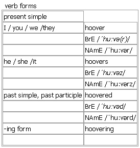 hoo·ver [hoover hoovers hoovered hoovering] BrE [ˈhuːvə(r)] NAmE [ˈhuːvər] verb transitive, intransitive ~ (sth) (BrE) to clean a carpet, floor, etc. with a ↑vacuum cleaner Syn: ↑vacuum •to hoover the carpet Derived Word: ↑hoovering Derived: ↑hoover something up Verb forms: Example Bank: •You can do the hoovering while I hang out the washing.