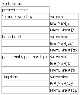 wrench [wrench wrenches wrenched wrenching] verb, noun BrE [rentʃ] NAmE [rentʃ] verb 1. transitive, intransitive to pull or twist sth/sb/yourself suddenly and violently Syn: ↑jerk •~ (sth/sb/yourself) + adv./prep. The bag was wrenched from her grasp. •He grabbed Ben, wrenching him away from his mother. • (figurative)Guy wrenched his mind back to the present. •~ (sth/sb/yourself) + adj. They wrenched the door open. •She managed to wrench herself free. 2. transitive ~ sth to twist and injure a part of your body, especially your ankle or shoulder Syn: ↑twist •She wrenched her knee when she fell. 3. transitive, intransitive (formal)to make sb feel great pain or unhappiness, especially so that they make a sound or cry •~ (sth) (from sb) His words wrenched a sob from her. •a wrenching experience •~ at sth Her words wrenched at my heart. see also ↑gut-wrenching Verb forms: Word Origin: late Old English wrencan ‘twist’, of unknown origin. Example Bank: •He wrenched the handbag from her grasp. •I slipped and wrenched my ankle quite badly. •She struggled with her captor and managed to wrench herself free. •She tried to wrench her arm away. •She wrenched the gun out of his hand. •She wrenched the lid off the biscuit tin. •Suddenly, the door was wrenched open. •The child wrenched himself free. Idiom: ↑throw a wrench in something noun  1. (especially NAmE) (BrE usually span·ner)countable a metal tool with a specially shaped end for holding and turning things, including one which can be adjusted to fit objects of different sizes, also called a ↑monkey wrench or an ↑adjustable spanner 2. singular pain or unhappiness that you feel when you have to leave a person or place that you love •Leaving home was a terrible wrench for me. 3. countable, usually singular a sudden and violent twist or pull •She stumbled and gave her ankle a painful wrench. Word Origin: late Old English wrencan ‘twist’, of unknown origin. See also: ↑spanner