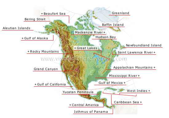 1. a continent (the third largest) in the western hemisphere connected to South America by the Isthmus of Panama (Freq. 4) • Members of this Region: Plantation, continental divide, Latin America, canyon, canon, plainsman • Instance Hypernyms: continent • Part Holonyms: western hemisphere, occident, New World, West, Occident, northern hemisphere, America • Member Meronyms: North American • Part Meronyms: North American country, North American nation, Mesoamerica, Central America, Canada, United States, United States of America, America, the States, US, U.S., USA, U.S.A., Coast Range, Coast Mountains, Great Plains, Great Plains of North America, Rockies, Rocky Mountains 2. the nations of the North American continent collectively • Hypernyms: collection, aggregation, accumulation, assemblage • Member Meronyms: American