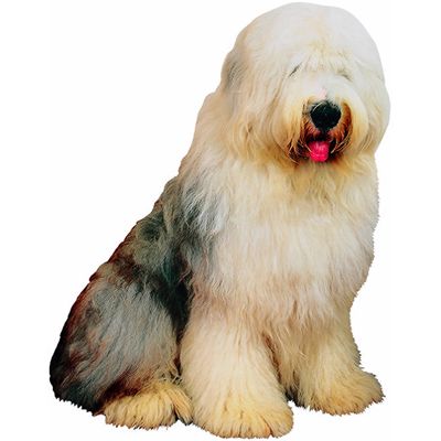 large sheepdog with a profuse shaggy bluish-grey-and-white coat and short tail;