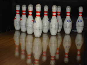 1. a game in which balls are rolled at an object or group of objects with the aim of knocking them over or moving them • Members of this Topic: pocket, convert • Hypernyms: game • Hyponyms: tenpins, tenpin bowling, ninepins, skittles, duckpins, duckpins, candlepin bowling, lawn bowling, bowls, bocce, bocci, boccie • Part Meronyms: frame 2. (cricket) the act of delivering a cricket ball to the batsman • Topics: cricket • Hypernyms: throw • Hyponyms: Chinaman, googly, wrong 'un, bosie, bosie ball, no ball 3. the playing of a game of tenpins or duckpins etc • Members of this Topic: bowl • Hypernyms: playing • Part Meronyms: roll, bowl, run-up