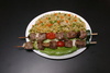 cubes of meat marinated and cooked on a skewer usually with vegetables
