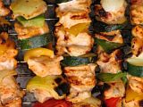 cubes of meat marinated and cooked on a skewer usually with vegetables
