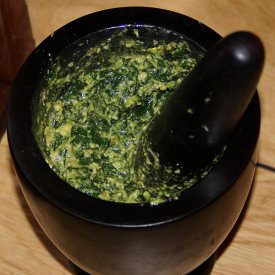 contains crushed basil leaves and garlic and pine nuts and Parmesan cheese in olive oil