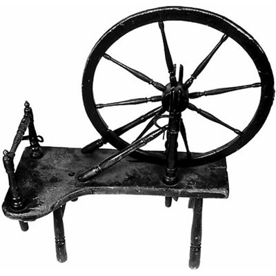 a small domestic spinning machine with a single spindle that is driven by hand or foot