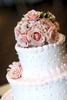 a rich cake with two or more tiers and covered with frosting and decorations;